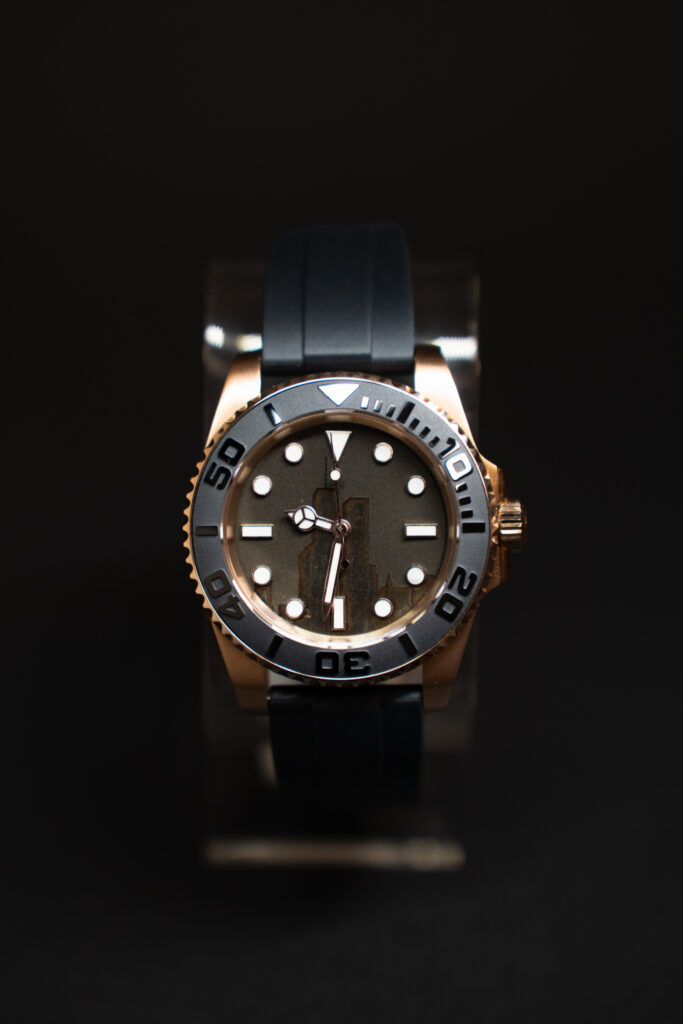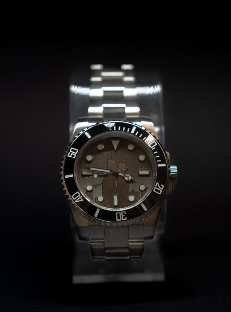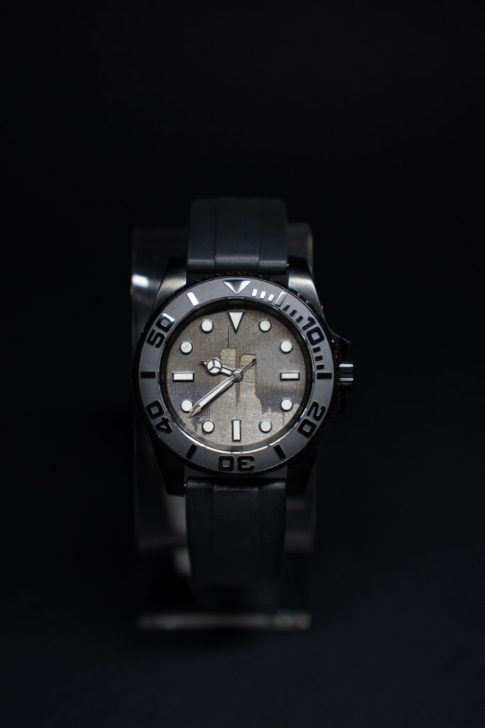 After cleaning up of the site, debris became a huge problem. In all, there was 180,000,000 tons of debris recovered from ground zero. It is estimated that some 200,000 tons of steel collapsed to the ground when the twin towers collapsed. According to an article in the journal Places, by spring of 2002 most of the structural steel had been transported to New Jersey. New York City sold about 175,000 tons of the scrap. Some was sold to various places in the United States and about 60,000 tons went to companies in China, India and South Korea according to news reports. Much of the steel was sold to be recycled. Among what remained was about 7,000 tons of structural steel and artifacts. This was moved and stored in an 80,000 square foot hangar at John F. Kennedy International Airport and various entities began to express interest in using the steel for various memorials. Some of the steel went to build a Naval Ship, and some went to be recycled. A company in Statesboro, GA called International Agile Manufacturing obtained some of the steel from a recycling plant to make memorable medallions that they were selling as a part of history. Unfortunately, International Agile Manufacturing went bankrupt, and this is where Jeff came in. Jeff was able to obtain some of this steel from those medallions for his watches. Once he had his hands on that actual steel, he started looking for a way to use this steel as part of his watches. Jeff finally decided to use it to make the dials (face) of watch out of this steel. Rolex did a similar thing with a meteorite that they made into dials for their watches. Then Jeff wanted to take it a step further and include a picture of the twin towers on the dial of the watch to make a unique yet beautiful and memorable watch. The Twin Towers are actually lasered into the steel. The company name is left off of the front of the watch, so it doesn’t take away from the beauty of the Twin Towers. The company name, 343 Watch Company, is lasered engraved into the case back of the watch. The dial is then left as bare metal and not painted. This is so people can actually relate when they see the steel colored dial. The dial is clear coated to prevent rust even though the watch is water resistant.